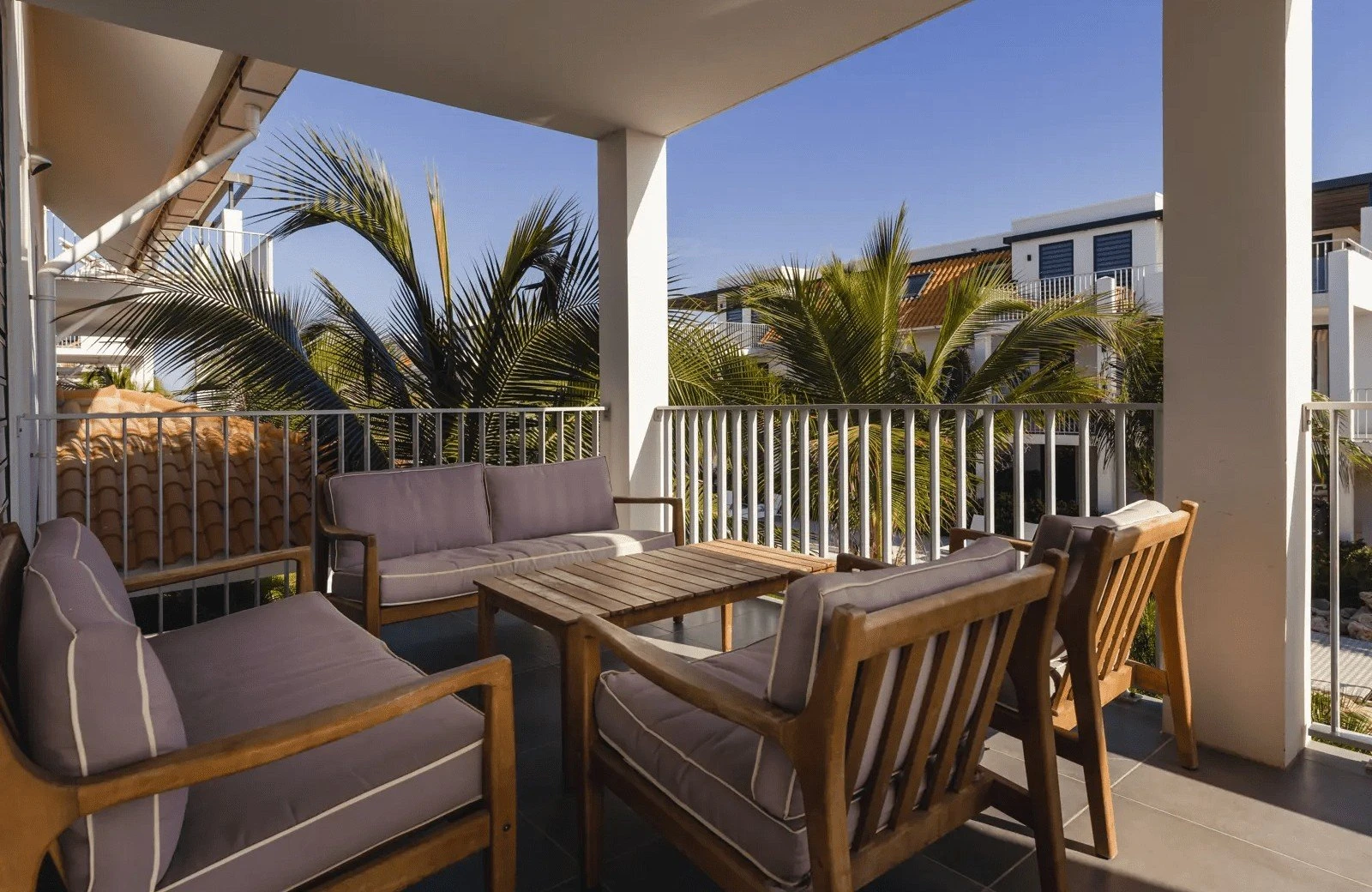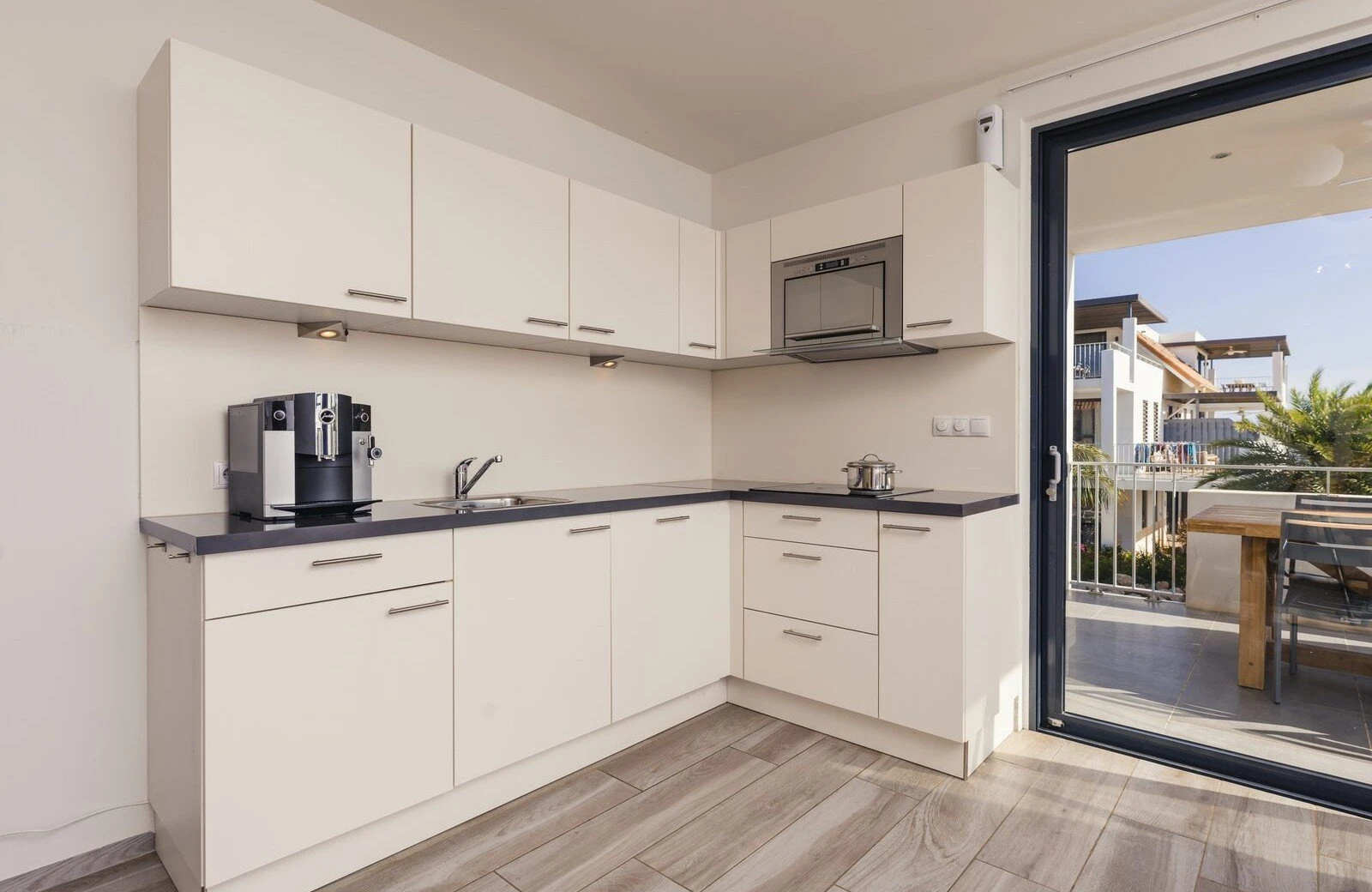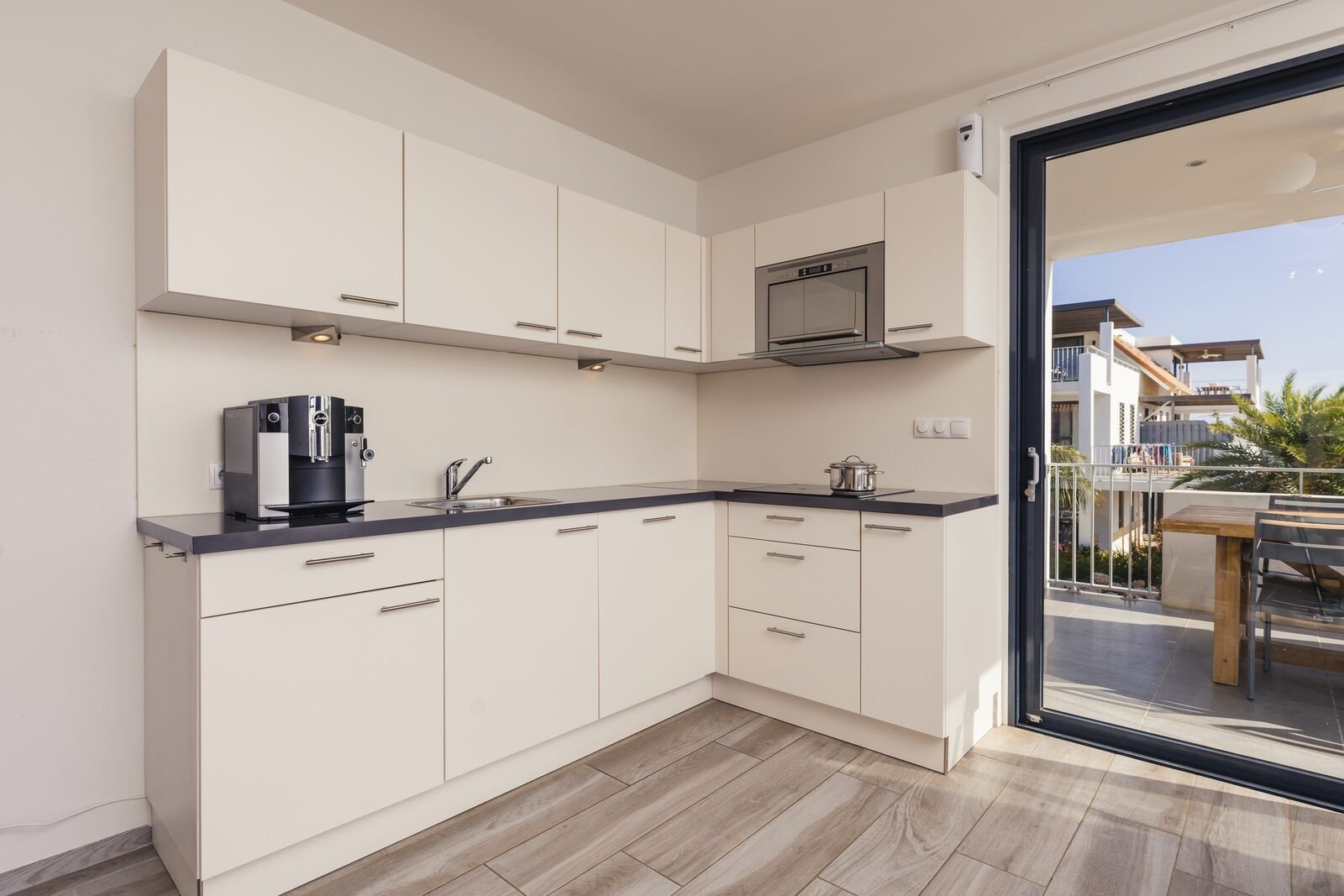 Dankzij de comfortabele slaapbank in de woonkamer creëer je moeiteloos twee extra slaapplaatsen. Het royale balkon van 18 tot 35 m² is bereikbaar via een grote schuifpui, waardoor binnen en buiten naadloos in elkaar overlopen. Hier laat je je meevoeren door de tropische bries en het uitzicht.